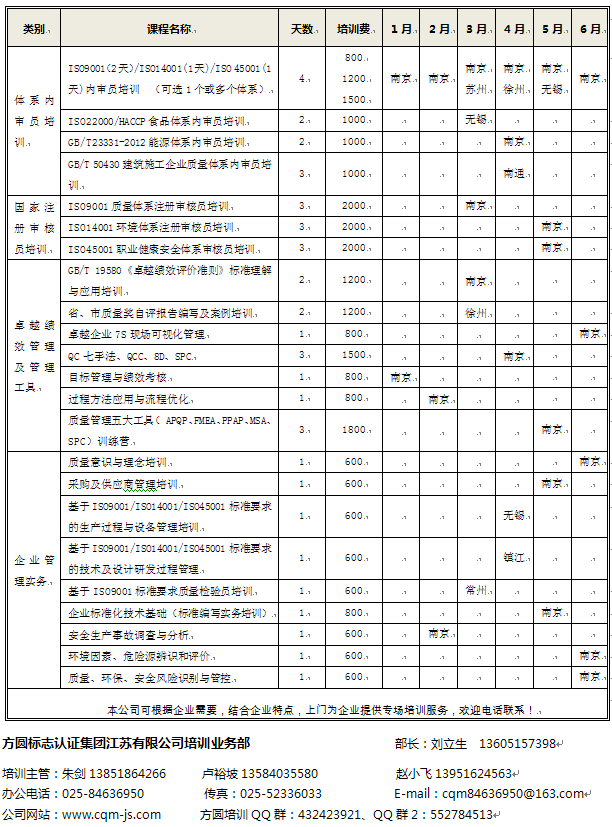 江苏公司2019年公开班培训计划(1-6月份)