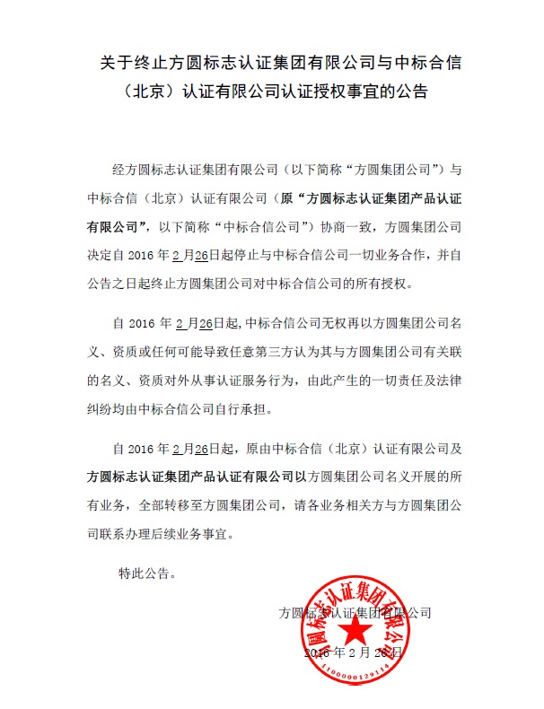九游 SPORTS终止九游体育(中国)官方网站与中标合信(北京)认证有限公司认证授权事宜的公告