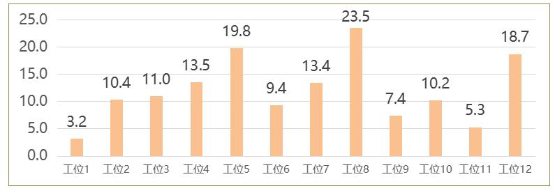 经过细致的分析,确定了改善前的线体平衡率=52%,人数12人,单小时产能UPH=138个,人均效率UPPH=11.5个。