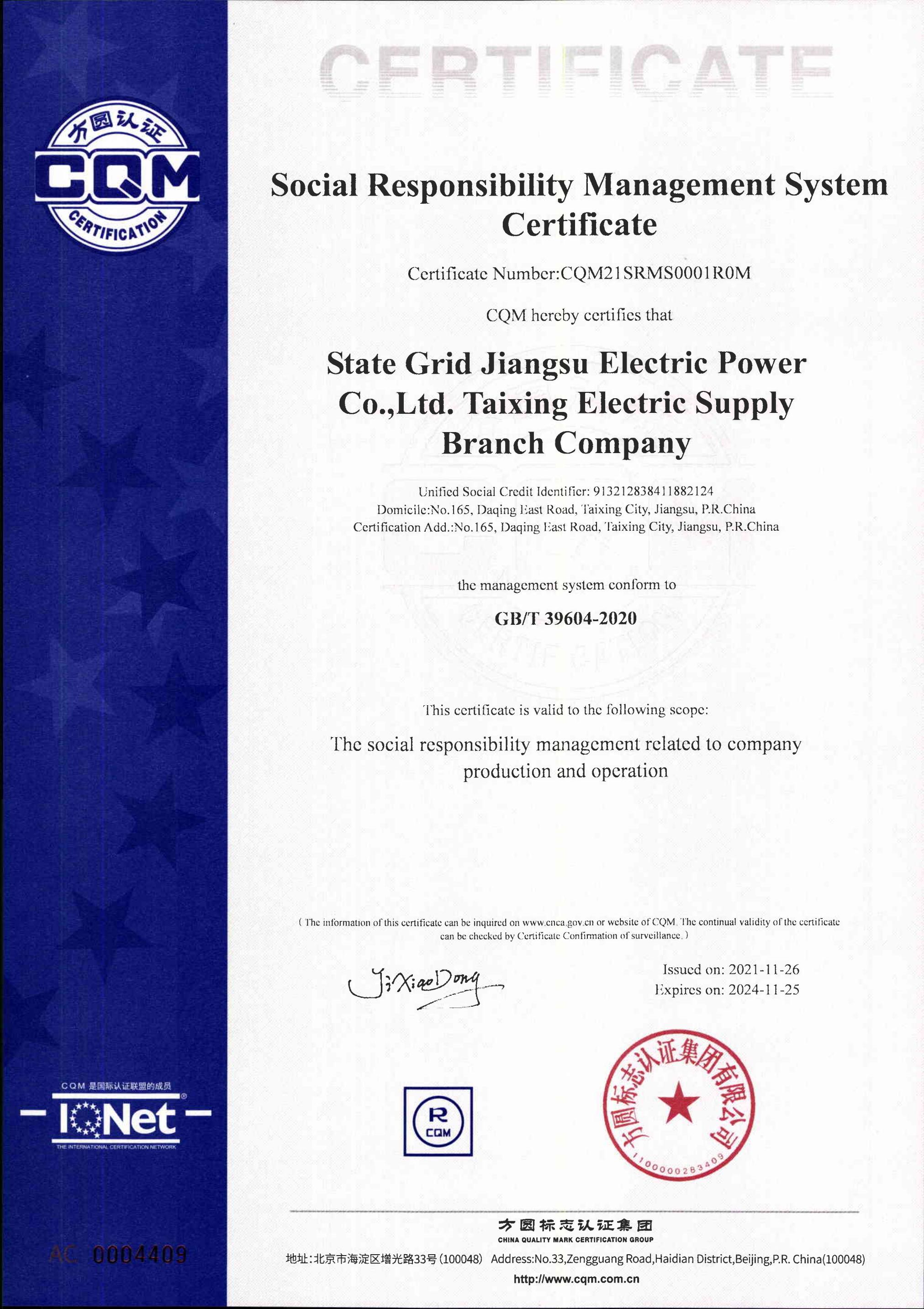 2021年11月,方圆标志认证集团对国网江苏省电力有限公司泰兴市供电分公司实施了社会责任管理体系认证审核,审核组对国网泰兴市供电分公司系统化地开展社会责任管理工作、推行全面社会责任落地管理、社会责任绩效等方面给予高度评价,并于2021年11月26日颁发了方圆标志认证集团首张社会责任管理体系认证证书,开启了方圆集团推动我国社会责任管理体系认证工作健康有序发展的序幕。
