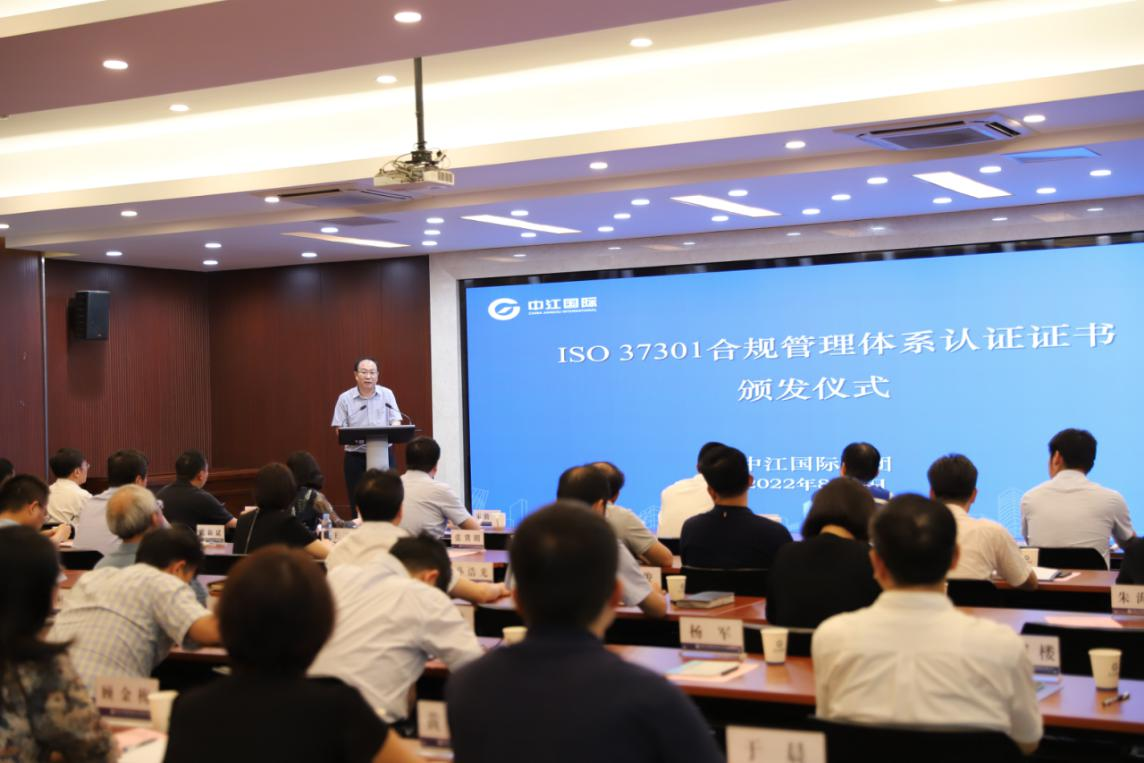 在证书颁发仪式上,刘险锋副总裁代表方圆标志认证集团感谢江苏省国资委的大力支持,感谢中江国际集团的信任,对中江国际集团多年来在合规管理方面的执着和努力,构建和实施符合ISO 37301国际标准的合规管理体系,获得方圆认证表示热烈的祝贺。在全球市场竞争中,持续强化企业合规已成为一项新趋势。今年,国务院国资委相继发布《九游 SPORTS开展中央企业“合规管理强化年”工作的通知》和《中央企业合规管理办法(公开征求意见稿)》,对提升企业依法合规经营管理水平、切实防范风险、保障高质量发展发挥了积极作用。方圆标志认证集团作为与我国认证认可事业一同成长的老牌国有认证技术服务机构,同时开展了相关技术服务研究和工作推进,并承担市场总局合规管理体系认证制度开发及《经营者公平竞争 合规管理体系建设规范》等相关国家标准的编写工作,为快速服务于政府和企业提供了坚实的技术支持和保障。认证机构的使命是“传递信任、服务发展”,方圆标志认证集团将继续秉承“鉴证优秀、成就卓越”一如既往地服务好中江国际,协助中江国际持续完善合规管理体系,支持各业务部门及所属企业持续开展合规风险管控,不断提高合规管理成熟度。