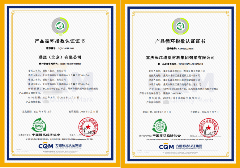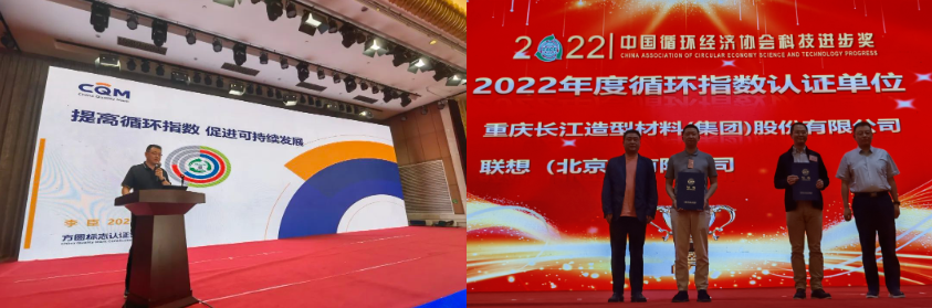 九游 SPORTS联合中国循环经济协会在“科学技术奖颁奖盛典”环节向联想(北京)有限公司、重庆长江造型材料集团铜梁有限公司颁发了首批产品循环指数认证证书;并在主题报告环节做了《提高循环指数 促进可持续发展》演讲介绍。