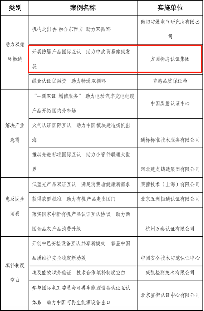 质量认证“小而美”国际互认合作优秀案例名单