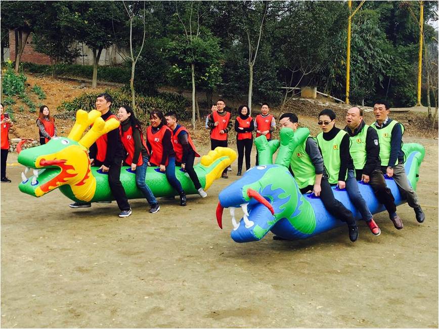 “旱地划龙舟”两队气势蓬勃,蓄势待发,一致的口号与步伐带领团队走向胜利