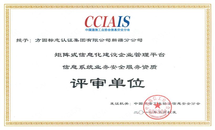 2017年5月,中国通信工业协会信息安全分会(CCIAIS)向方圆新疆分公司核发了“矩阵式信息化建设企业管理平台--信息系统业务安全服务资质评审单位”证书,授权方圆新疆分公司为中国通信工业协会信息安全分会“信息系统业务安全服务资质”二类评审机构,可在授权区域内开展“信息系统业务安全服务资质”三级资质的评审工作。