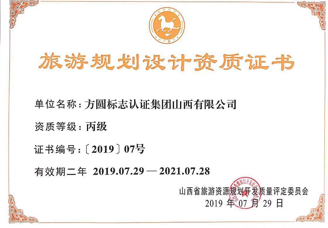 2019年7月29日,方圆山西公司被山西省旅游资源规划开发质量评定委员会认定为丙级资质旅游规划设计单位。