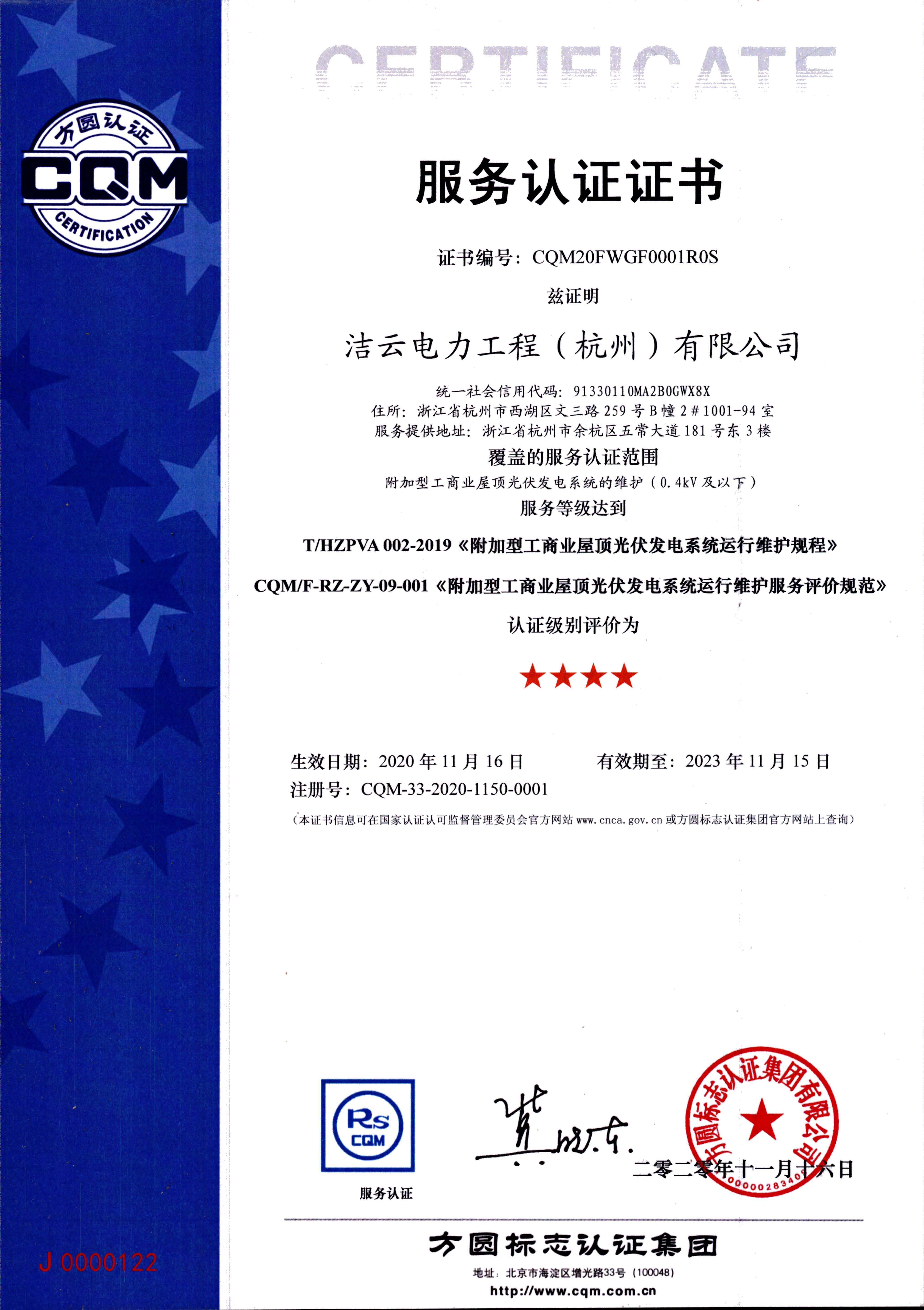 首张屋面光伏运维服务证书颁发给洁云电力工程(杭州)有限公司,意味着企业的光伏电站运维能力得到了第三方认定,意味着实现了与杭州光伏协会联合开发光伏行业科学、规范、量化地标准客观评价服务标准的目标。