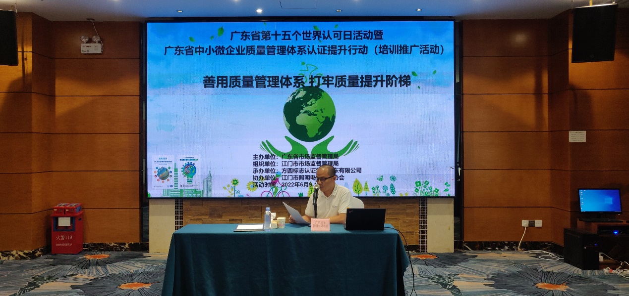 本次培训由广东省市场监督管理局主办、江门市市场监督管理局组织、方圆广东公司承办、江门市照明协会协办,旨在通过培训帮助中小微企业有效实施 ISO9001 质量管理体系,提升企业质量管理体系运行能力。